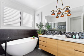 -Central family bathroom with freestanding bath, shower and vanity.